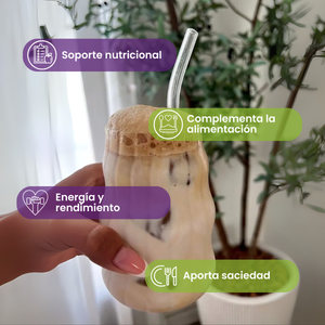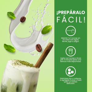 - Mezcla una y media (1, 1/5) cucharas dosificadoras en un vaso de leche, agua o yogur y deja licuar por al menos 1 minuto.