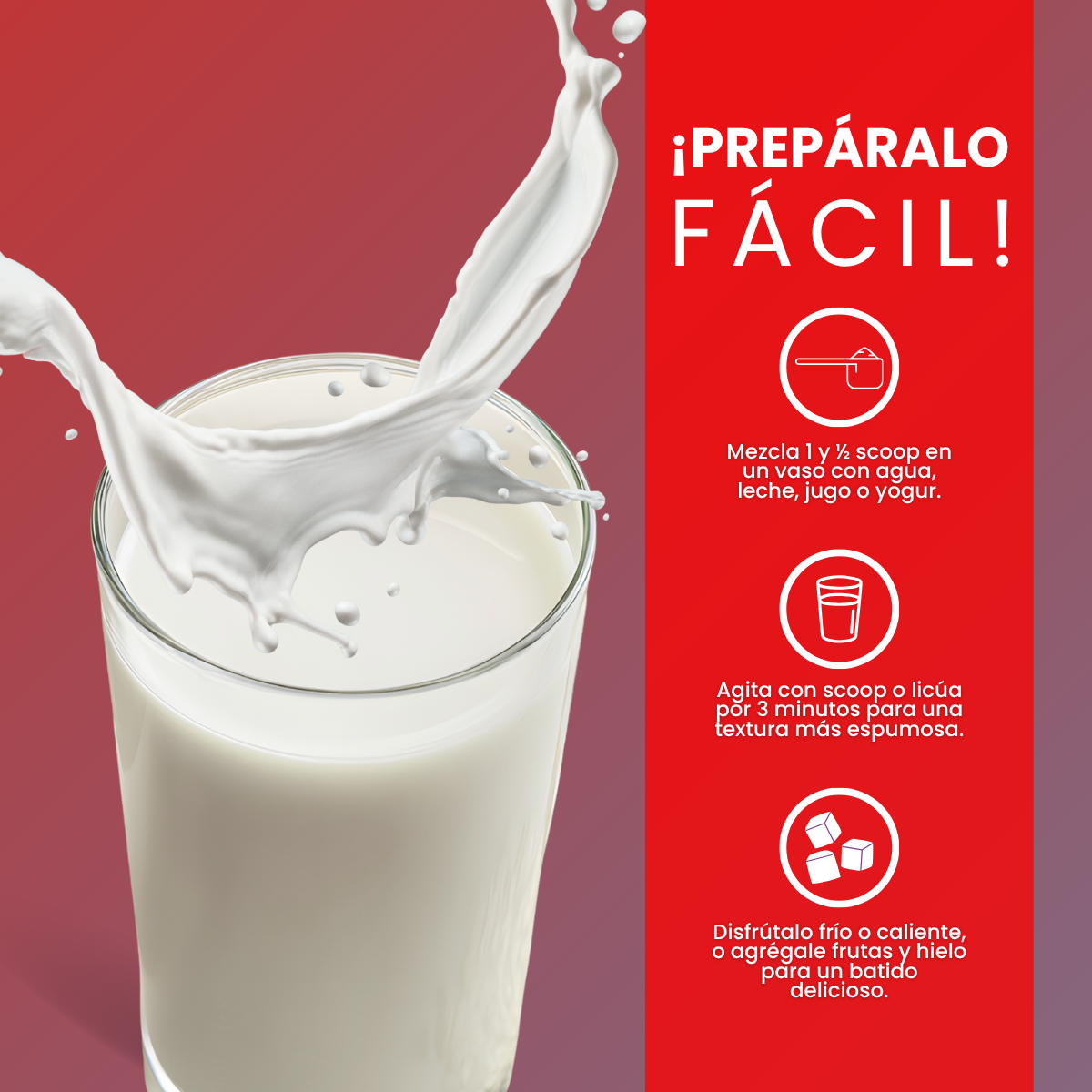 Mezcla una y media (1, 1/5) cucharas dosificadoras en un vaso de leche, agua o yogur y dejas licuar por al menos 1 minuto.