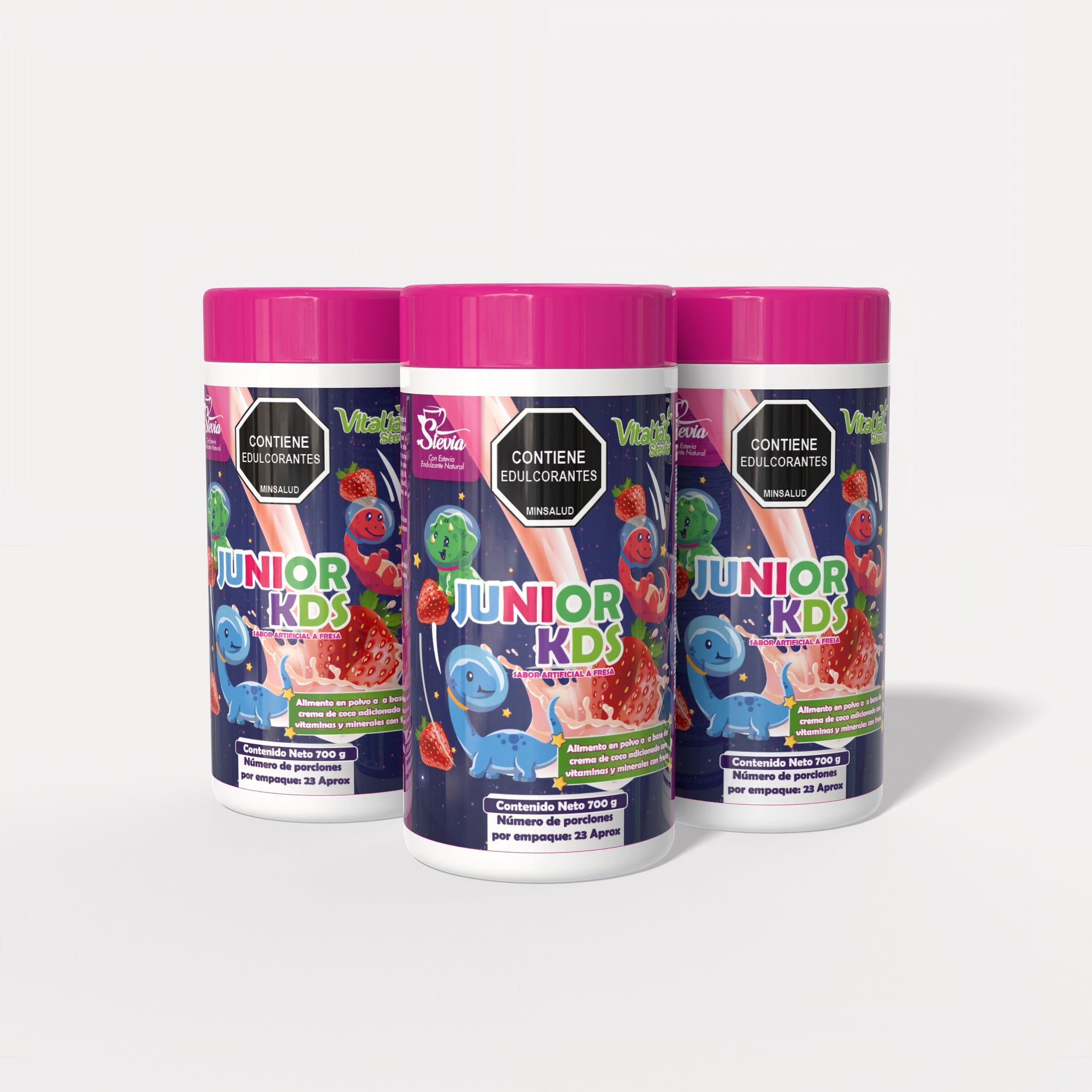 Junior KDS es un producto de carácter alimenticio con un delicioso sabor artificial a fresa , con vitaminas adicionadas y minerales.
